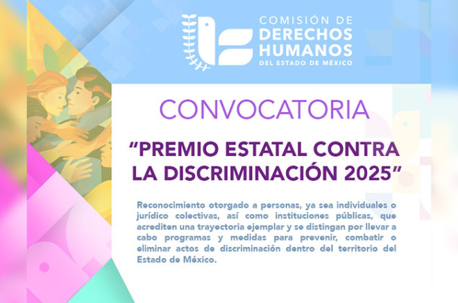 La Comisión de Derechos Humanos del Estado de México (CODHEM) convoca a participar en el “Premio Estatal Contra la Discriminación 2025”, que busca reconocer aquellas acciones ejemplares que, desde una mirada integral, contribuyen a prevenir, combatir y eliminar cualquier forma de discriminación en la entidad, reconociendo que la discriminación no afecta a todas las personas de la misma manera, y que diversos factores como el género, la edad, el origen étnico, la orientación sexual, la discapacidad o la situación migratoria pueden cruzarse y generar condiciones particulares de exclusión múltiple.