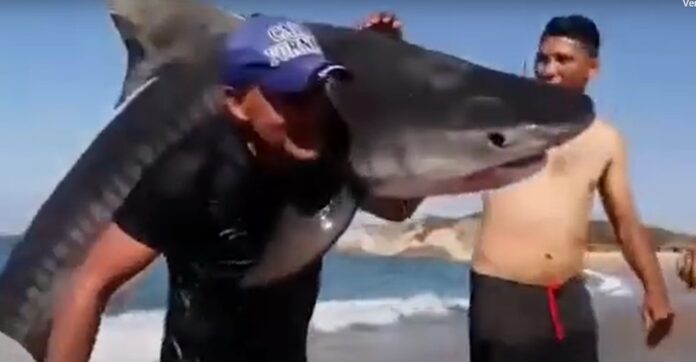 Captan a hombre atrapando a un tiburón tigre con sus manos en costas de Michoacán