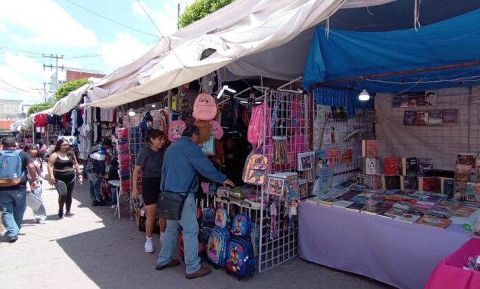 En Huehuetoca, los puestos de útiles escolares instalados a un costado de la iglesia municipal registran gran afluencia de padres de familia, que buscan el mejor precio en mochilas, cuadernos y uniformes.