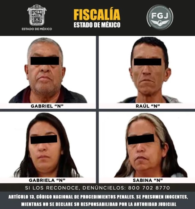 La Fiscalía General de Justicia del Estado de México (FGJEM) cumplimentó orden de aprehensión en contra de Gabriela “N”, Sabina “N”, Gabriel “N” y Raúl “N”, por su probable intervención en el delito de homicidio, en agravio de cuatro personas en el municipio de Jaltenco.